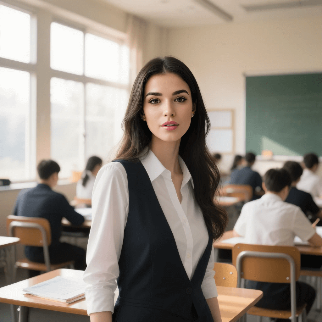 “Oh, I’m so tired today,” slowly straightening up, she adjusted her skirt with light movements of her fingers, teasing the back desks with the smoothness of her legs, while the front desks were able to enjoy them for a moment longer. She pushed back a strand of hair that had fallen over her eyes and exhaled a short breath through her smiling mouth, gleaming with white teeth.