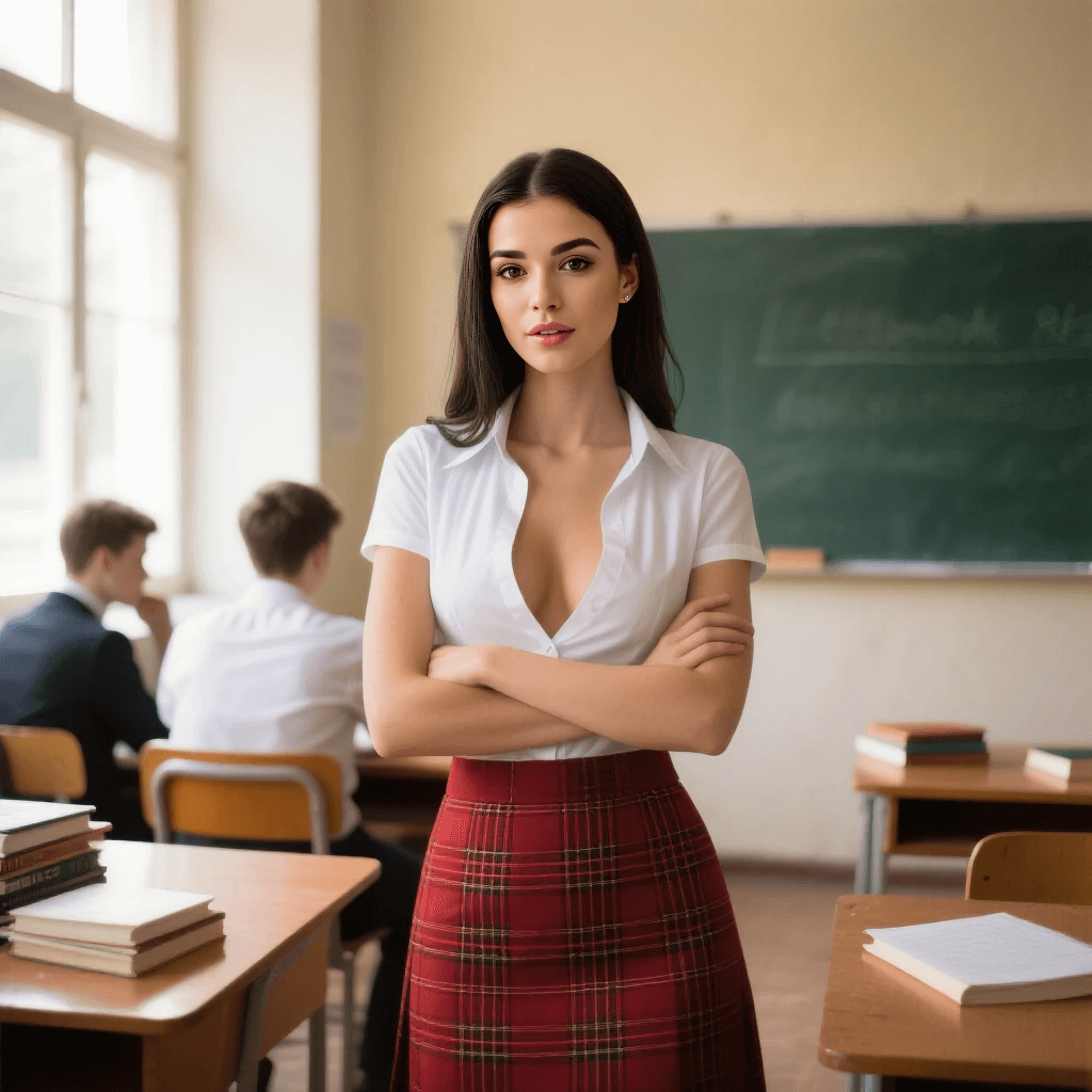 “Oh, I’m so tired today,” slowly straightening up, she adjusted her skirt with light movements of her fingers, teasing the back desks with the smoothness of her legs, while the front desks were able to enjoy them for a moment longer. She pushed back a strand of hair that had fallen over her eyes and exhaled a short breath through her smiling mouth, gleaming with white teeth.